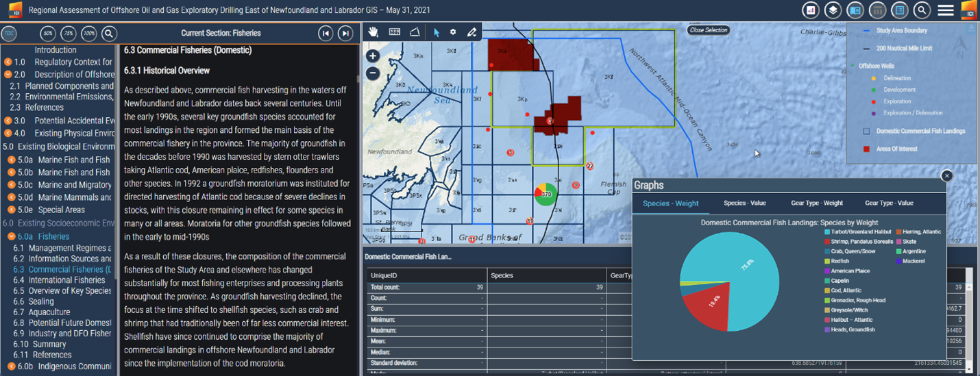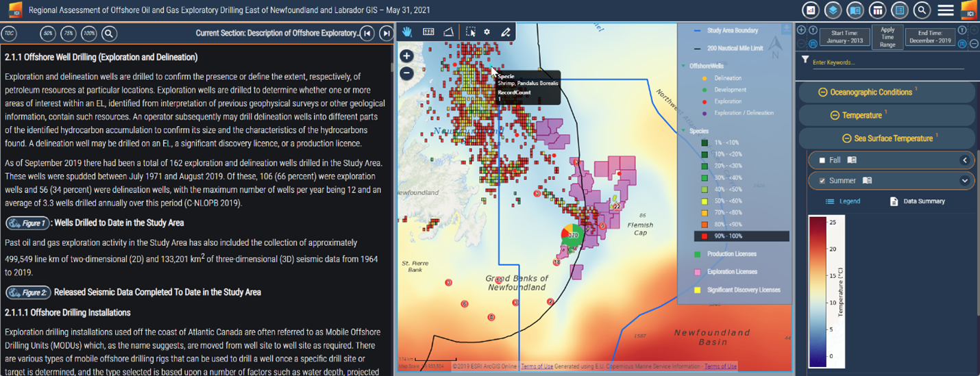 The final ReportViz application for the RA provided a comprehensive mapping solution for a large area of Canada’s eastern offshore environment. The application was delivered within budget at the completion of IAAC’s first regional assessment in May 2020. With over 200 unique layers, the solution offered unprecedented access to a wide array of information related to the region’s physical, biological, and socioeconomic environments. Rather than providing a typical document containing static figures of geospatial data, the RA application provided extensive information linked to an easy-to-use, yet powerful mapping solution enabling the public to explore data and layer interactions with better information flow. The result was an improved understanding of the potential effects of exploration drilling activities for offshore Newfoundland and Labrador.